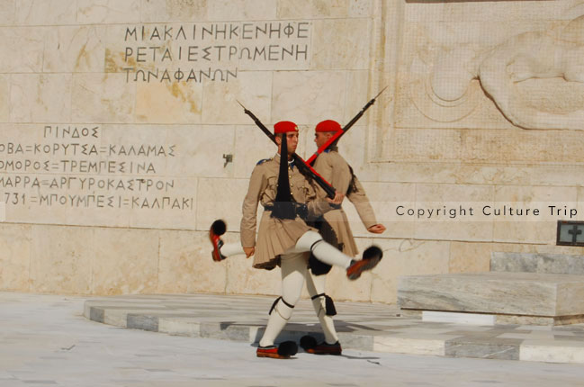 Le Monument du Soldat inconnu, installé devant le Parlement hellénique, est gardé en permanence par les Evzones qui effectuent leur service militaire. La sélection est très sévère et la formation très difficile.