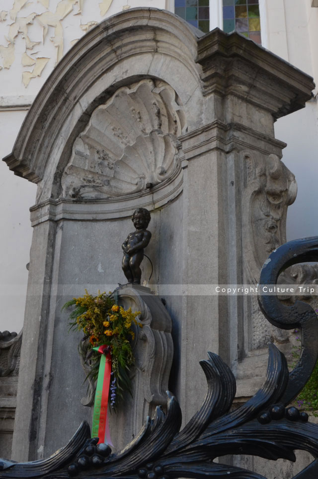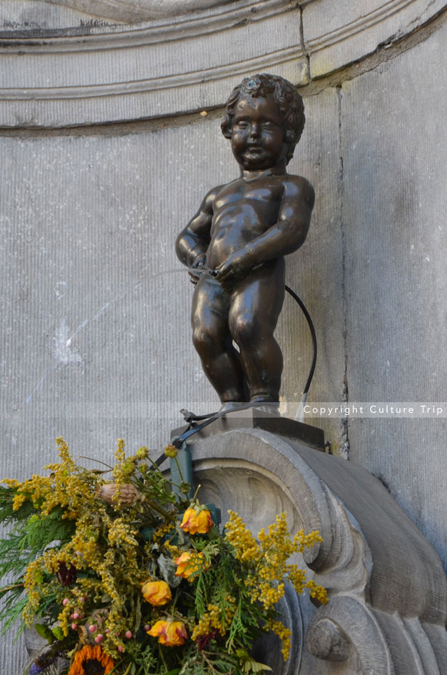 L'enfant nu urine dans une fontaine qui alimentait les habitants du quartier en eau potable. Le Manneken-Pis a une petite sœur, Jeanneke-Pis, qui est située dans l'impasse de la Fidélité.