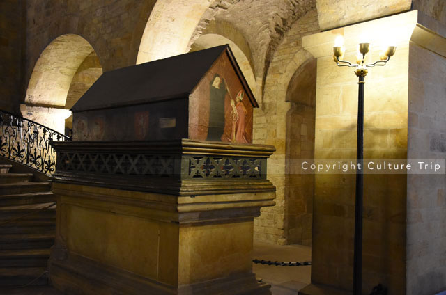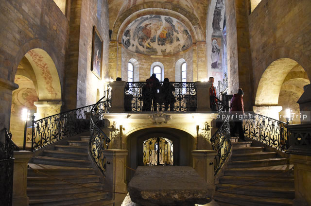 Un escalier a été ajouté à l'abside, décorée de fresques, à l'époque baroque. La crypte, située sous le chœur, est voûtée en croisées d’ogive qui s’appuient sur de fines colonnes aux chapiteaux cubiques.
