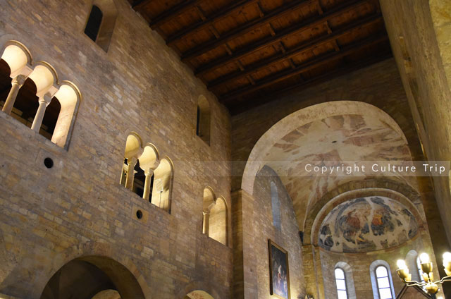 L'édifice a conservé le plan traditionnel des basiliques romanes avec une nef haute et étroite et, derrière le chœur, une abside semi-circulaire. Deux nefs latérales ont cependant été ajoutées. L'aspect intérieur de la basilique, avec ses murs de pierre calcaire, est sobre et austère.