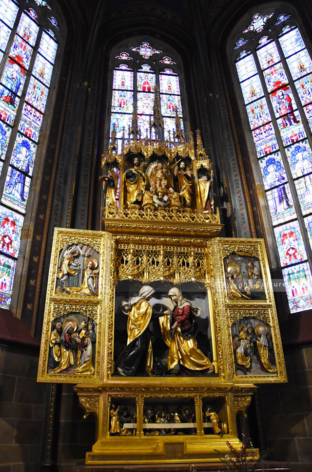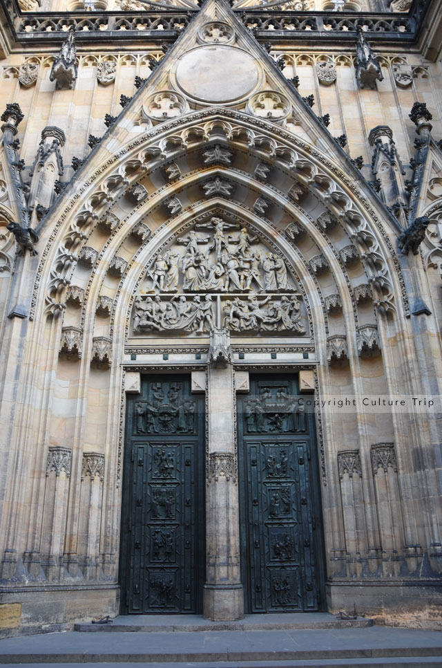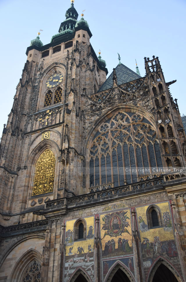 Les guerres hussites (1419-1436) et plusieurs incendies ont ralenti sa construction. Elle a été achevée en 1929, soit 585 ans après le début des travaux.