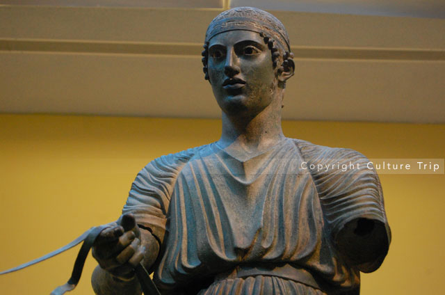 La statue d'un mètre 80 représente un aurige, un conducteur de char. Elle a été découverte en 1896 à Delphes sous la Voie sacrée. Le bras gauche est manquant.