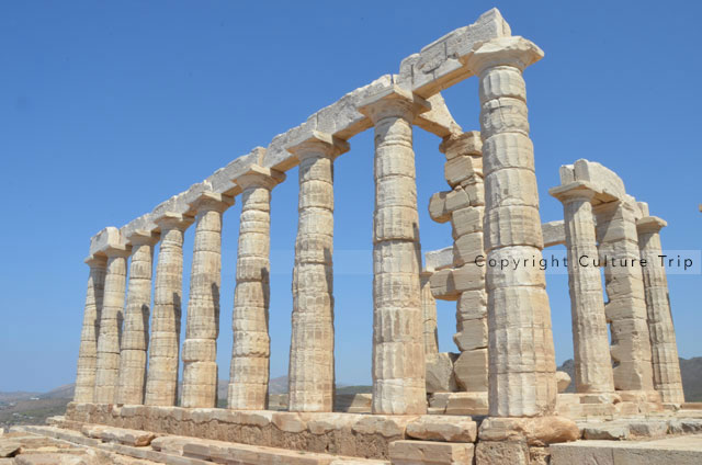 Le cap Sounion est surtout renommé pour les ruines d'un temple dédié à Poséidon. L'édifice a été bâti au milieu du Ve siècle av. J.-C., au lendemain des guerres médiques(490-479 av. J.-C.).