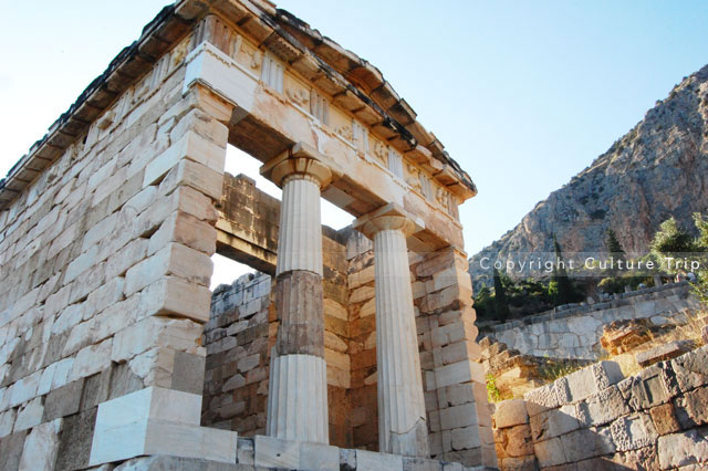 Le Trésor des Athéniens a été construit vers 490-480 av. J.-C.. L'édifice, d'ordre dorique, commémore la victoire de Marathon où les Grecs battirent les Perses en 490 av. J.-C.. Le décor de l'édifice est composé de métopes représentant les exploits du demi-dieu Héraclès et de Thésée. Sur l'avant, il présente une amazonomachie (le combat de Grecs contre le peuple des Amazones).