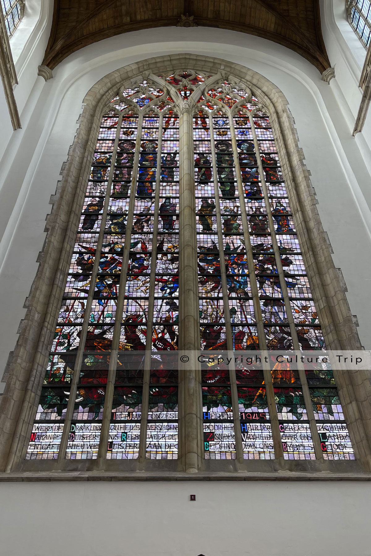 L'intérieur de l'église comprend une chaire de 1548, une ravissante chapelle et 27 vitraux colorés qui commémorent la libération du pays en 1945.