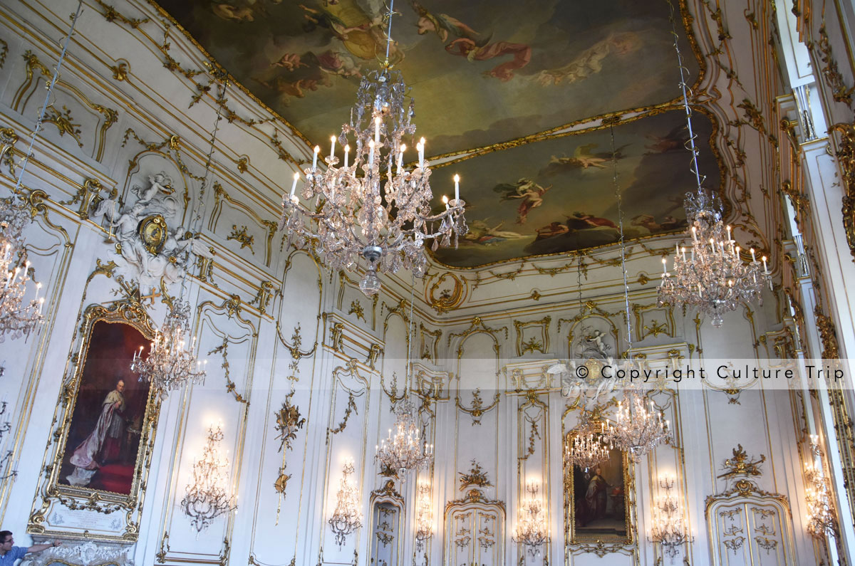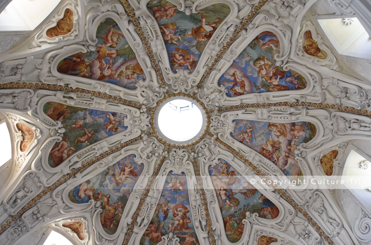 Le bâtiment fut réalisé par des artistes italiens. L'ornementation en stuc est l'œuvre de Quirico Castelli et de Carlo Borsa.